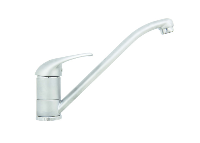 Представлений тут настільний, одноважільний, кухонний змішувач SC8007G серії Giglio від Emmevi зроблений із високоякісної латуні з покриттям кольору матового хрому, має довжину поворотного виливу 21.5 см. Модель встановлюється на один отвір використовуючи гнучкі шланги для підведення води М10*1/2″.