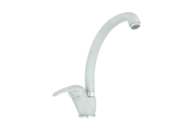 Представлений тут настільний, одноважільний, кухонний змішувач SC8087G серії Giglio від Emmevi зроблений із високоякісної латуні з покриттям кольору матового хрому, має довжину поворотного виливу 22 см. Модель встановлюється на один отвір використовуючи гнучкі шланги для підведення води М10*1/2″.