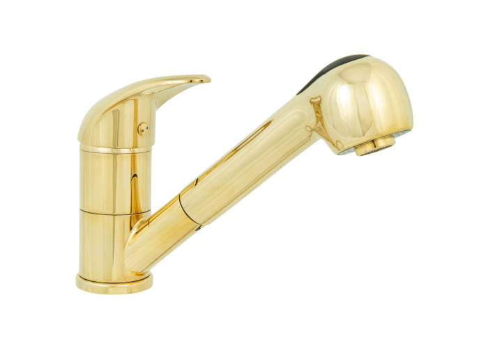 Представлений тут настільний, одноважільний кухонний змішувач Luxor OR7065R від Emmevi, виготовлений з високоякісної латуні з керамічним картриджем і покриттям кольору золота, має поворотний, висувний вилив з виносом 21.5 см. Модель встановлюється на один отвір використовуючи гнучкі шланги для підведення води М10*1/2″.