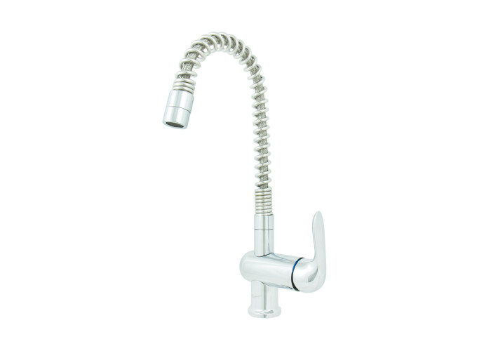 Представлений тут настільний, одноважільний кухонний змішувач Neco CR91510 від Emmevi, виготовлений з високоякісної латуні із покриттям кольору хрому, має поворотний, на пружині, вилив з виносом 17.2 см. Модель встановлюється на один отвір використовуючи гнучкі шланги для підведення води.