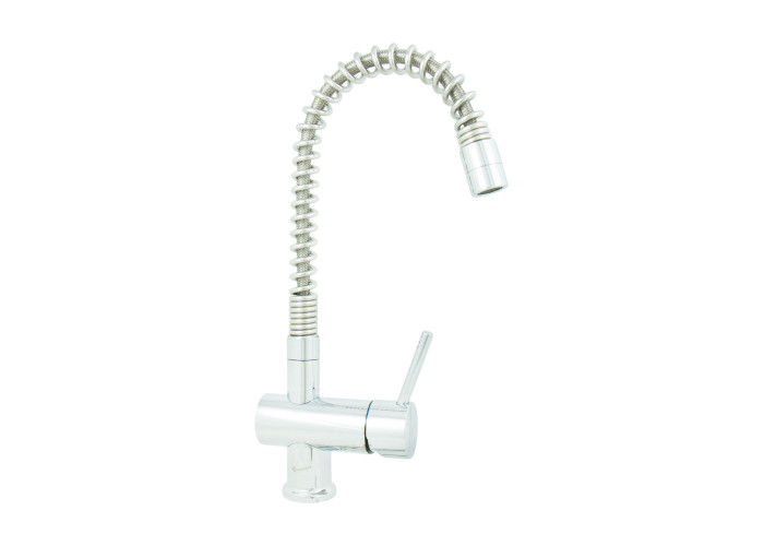 Представлений тут настільний, одноважільний кухонний змішувач Piper CR45510 від Emmevi, виготовлений з високоякісної латуні із покриттям кольору хрому, має поворотний, на пружині, вилив з виносом 17.2 см. Модель встановлюється на один отвір використовуючи гнучкі шланги для підведення води.