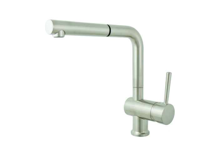 Представлений тут настільний, одноважільний кухонний змішувач Piper NS45066 від Emmevi, виготовлений з високоякісної латуні з керамічним картриджем і покриттям кольору нікелю, має поворотний, висувний вилив з виносом 25 см. Модель встановлюється на один отвір використовуючи гнучкі шланги для підведення води М10*1/2″.
