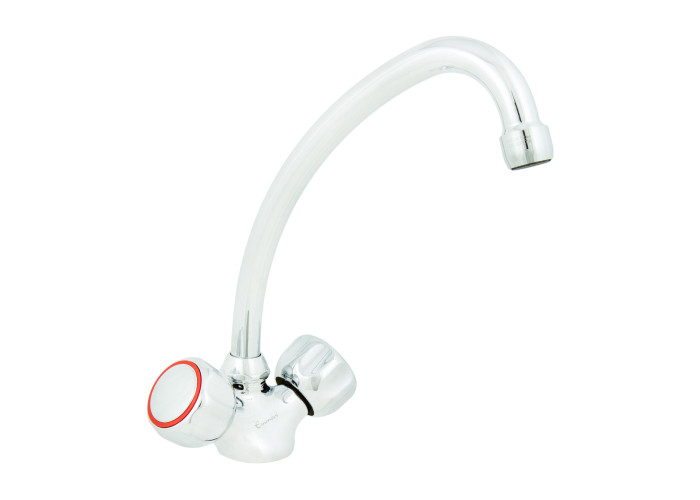 Представлений тут настільний, двовентильний кухонний змішувач Sole CR15217 від Emmevi, виготовлений з високоякісної латуні із покриттям кольору хрому, має поворотний вилив з виносом 18 см. Модель встановлюється на один отвір використовуючи гнучкі шланги для підведення води.