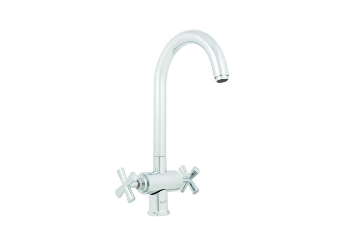 Представлений тут настільний, двовентильний кухонний змішувач Spirit New CR31007 від Emmevi, виготовлений з високоякісної латуні з керамічним картриджем і покриттям кольору хром, має поворотний вилив з виносом 19.5 см. Модель встановлюється на один отвір використовуючи гнучкі шланги для підведення води М10*1/2″.