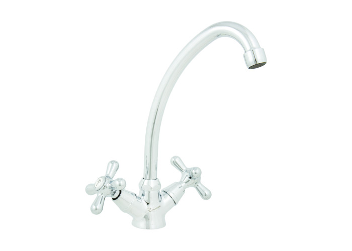 Представлений тут настільний, двовентильний кухонний змішувач Stella CR17207 від Emmevi, виготовлений з високоякісної латуні із покриттям кольору хрому, має поворотний вилив з виносом 18 см. Модель встановлюється на один отвір використовуючи гнучкі шланги для підведення води.