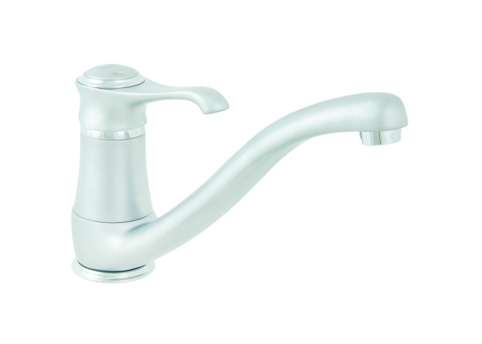 Представлений тут настільний, одноважільний кухонний змішувач Tiffany SC6095 від Emmevi, виготовлений з високоякісної латуні з керамічним картриджем і покриттям кольору матового хрому, має поворотний вилив з виносом 22 см. Модель встановлюється на один отвір використовуючи гнучкі шланги для підведення води М10*1/2″.
