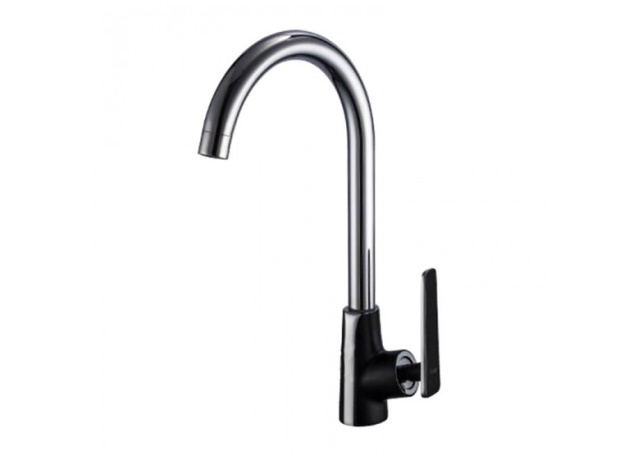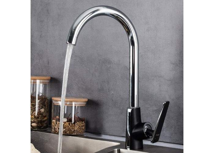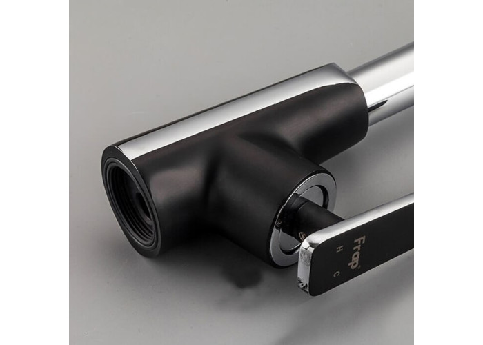 Змішувач для кухні Frap F4057 чорний з хромом буде стильно виглядати на сучасній кухні. Його високий виливши може обертатися навколо своєї осі. Завдяки цьому виріб можна встановлювати на мийки з декількома раковинами. Кріплення за допомогою гайки надійно утримує його на тонких поверхнях, перешкоджаю хитання і прокручування.