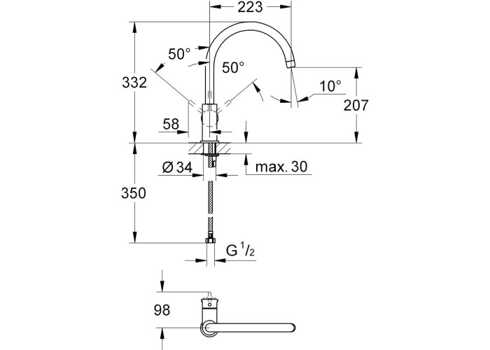 GROHE QuickFix - зручний монтаж. GROHE StarLight - хромоване покриття. GROHE ComfortHeight - високий вилив. GROHE SmoothTurn - плавний поворот виливу. GROHE Longlife - плавність ходу важеля.