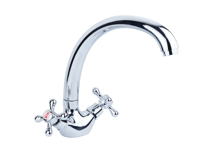 Змішувач VD 1/2" для кухні гусак вухо на гайці TAU (VD-4B461C). Мінімальний тиск в системі водопостачання: 0.5 бар. Максимальний тиск в системі водопостачання: 10 бар. Водневий показник води (pH): 6.5-8.5. Загальна мінералізація води: не більше 1500 г/м³. Тільки для чистої води без домішок, що містять абразиви (пісок, глину, вапно тощо). Змішувач для кухні VD-4B461C втілює два дизайнерських рішення: поворотний плавно вигнутий вилив і хрестоподібні вентилі, декоровані білими заглушками з червоним і синім логотипом для гарячої та холодної води. Така модель підійде для любителів класичних форм в кухонних інтер'єрах. Цей змішувач має низку переваг: глянсове хромонікелеве покриття, яке легко очищати і натирати до блиску м'якою тканиною; латунні кран-букси з дисками з кераміки для точного регулювання бажаної температури води, а також її напору; аератор, стабілізує потік і утримує вапняні відкладення; швидкий монтаж і просте обслуговування. Змішувач для кухні двохвентильний встановлюється без особливих зусиль з кріпленням на гайці. У комплекті з краном поставляються 2 гнучких підведення для підключення до магістралі. Гарантія надається протягом року з дня покупки.
