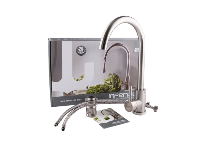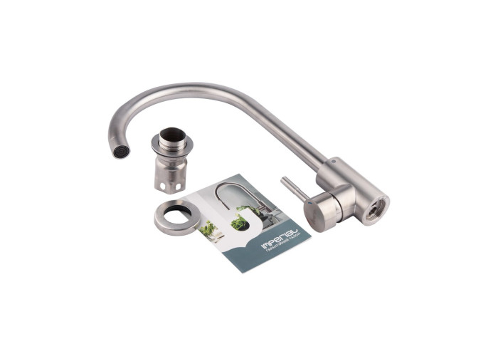 Змішувач для кухні Imperial 31-107-01 виготовлений з нержавіючої сталі. Завдяки нікельованій брашованій поверхні має оригінальний зовнішній вигляд. Виконаний в сучасному стриманому стилі. Такий змішувач не тільки зручний та практичний, а й ідеально доповнить інтер‘єр кухні. Після виточування вироби не проходять додаткове шліфування, незначні подряпини вважаються нормою і не є браком.