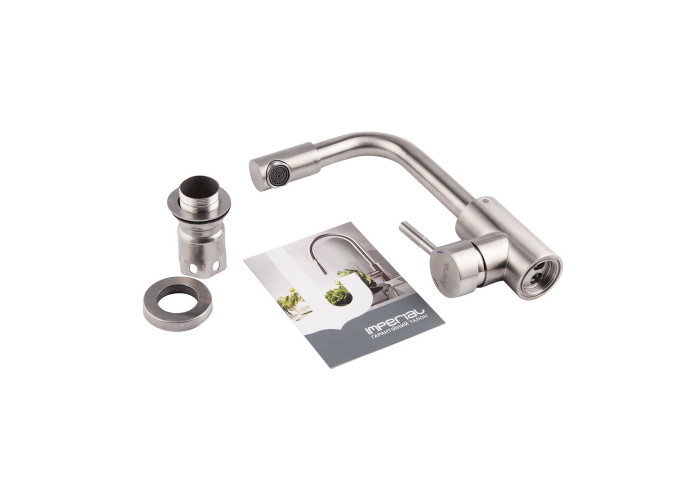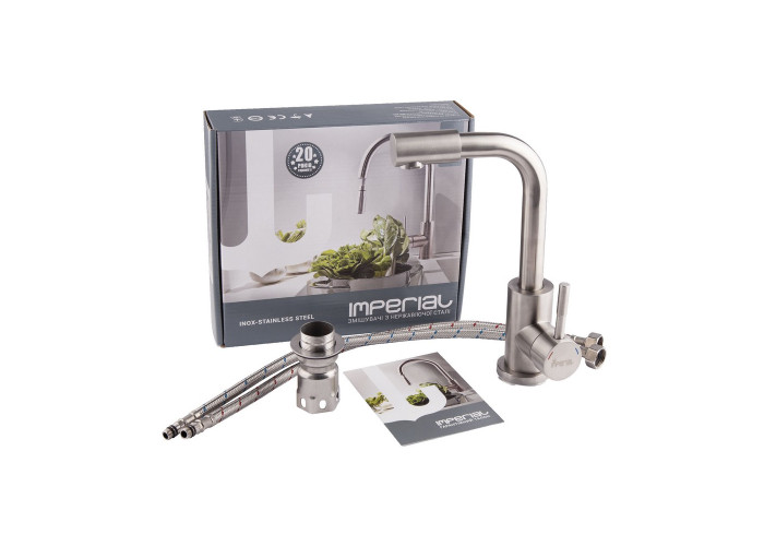 Змішувач для кухні Imperial 31-207-62 виготовлений з нержавіючої сталі. Завдяки нікельованій брашованій поверхні має оригінальний зовнішній вигляд. Виконаний в сучасному стриманому стилі. Такий змішувач не тільки зручний та практичний, а й ідеально доповнить інтер‘єр кухні. Після виточування вироби не проходять додаткове шліфування, незначні подряпини вважаються нормою і не є браком.