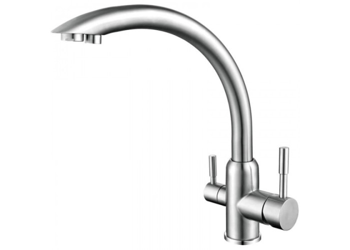 Змішувач для кухні на дві води Frap F43899 з нержавіючої сталі відрізняється підвищеною стійкістю до ржавіння під дією вологи. Так само даний матеріал не втрачає зовнішній вигляд, довго залишається акуратним і привабливим. Для догляду за ним досить використовувати мильну мочалку, обполіскувати і витирати насухо.