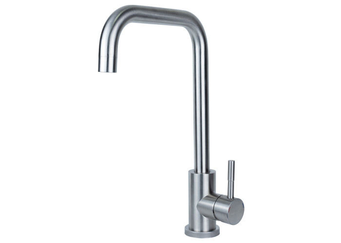 Змішувач KT Ø35 для кухні Г-гусак на гайці SS AQUATICA (KT-4B270P). Мінімальний тиск в системі водопостачання: 0.5 бар. Максимальний тиск в системі водопостачання: 10 бар. Водневий показник води (pH): 6.5-8.5. Загальна мінералізація води: не більше 1500 г/м³. Тільки для чистої води без домішок, що містять абразиви (пісок, глину, вапно тощо). Змішувач для кухні Акватика KT-4B170P виготовлений з нержавіючої сталі, вилив поворотний, Г-подібний. З його допомогою можна зручно помити не тільки столовий посуд, але і великогабаритний (великі каструлі, сковороди та ін.). Підходить для використання як в домашніх умовах, так і в пунктах громадського харчування. Переваги: зручність експлуатації; плавне регулювання подачі води; тривалий термін використання; захист від впливу зовнішніх факторів; проста установка. Щоб підключити змішувач для кухні, скористайтеся гнучким підведенням (поставляється в комплекті). Догляд за виробом досить простий: для усунення вапняного нальоту і крапель води використовуйте вологу м'яку губку або ганчірку з мікрофібри. Сильні забруднення можна видалити миючим засобом з гелевою структурою. Гарантія від виробника надається протягом 3-х років.