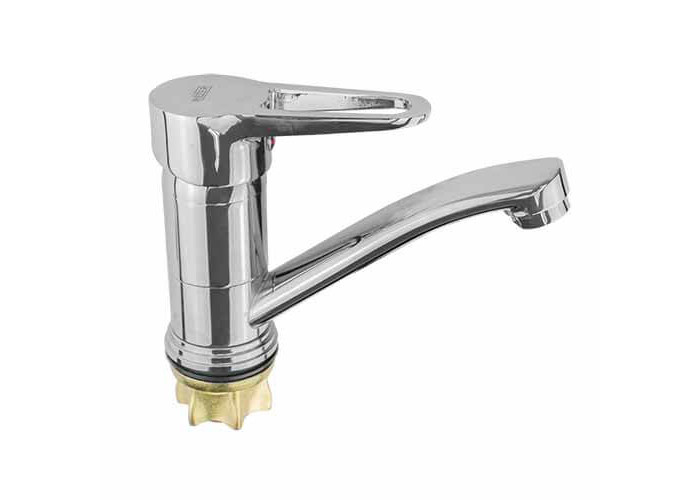 Змішувач однорукий з коротким гусаком для кухні WEZER. Діаметр картриджа Ø35. Кріплення – гайка. Матеріал силумін. Покриття хром. Виробник Китай. Клас економ.
