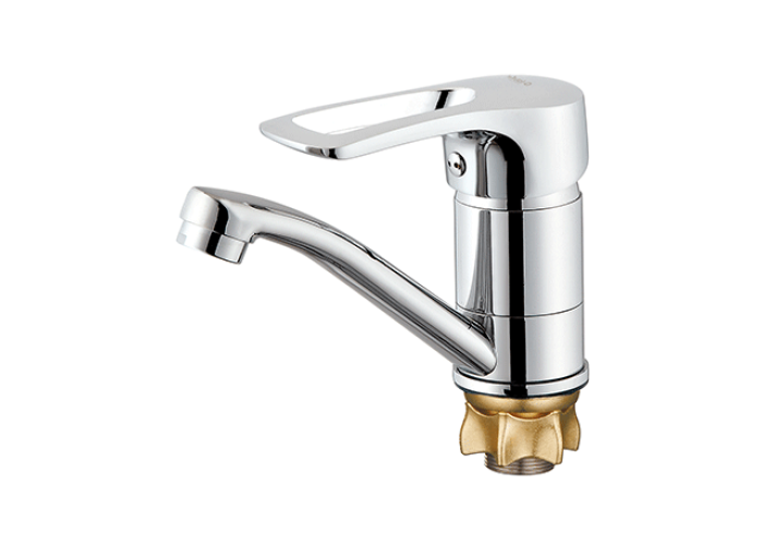 Змішувач для кухні однорукий WEZER з коротким гусаком. Діаметр картриджа Ø40. Кріплення – гайка. Матеріал – латунь. Покриття – хром. Виробник Китай. Клас економ.