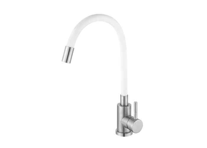 Змішувач для кухні Wezer EKO4X-01W володіє в своїй конструкції гнучким гусаком, який дозволяє комфортно здійснювати миття посуду, використовуючи різні кути потоку води. Матеріалом для корпуса даної моделі служить нержавіюча сталь. Вона володіє високими характеристиками міцності. Даний матеріал стійкий до корозії і дії абразивних сумішей. Всі змішувачі компанії Wezer проходять контроль якості на всіх етапах виробництва. Даний метод дозволяє значно підвищити ступінь якості всіх вироблених виробів. Також вся продукція Wezer, в тому числі і змішувачі для кухні мають сервісне обслуговування в Україні. Колір покриття: нержавіюча сталь / білий. Діаметр картриджа: 35 мм. Тип кріплення: гайка. Гусак: гнучкий / високий, з аератором. Довжина гнучкої частини виливу: 460 мм. Висота корпусу: 115 мм. Підводки: 500 мм. Довжина ручки: 52 мм. Діаметр гайки: 30 мм. Довжина гайки: 50 мм. Комплект поставки: змішувач, кріплення, гнучкі підводки. Країна-виробник - Китай.