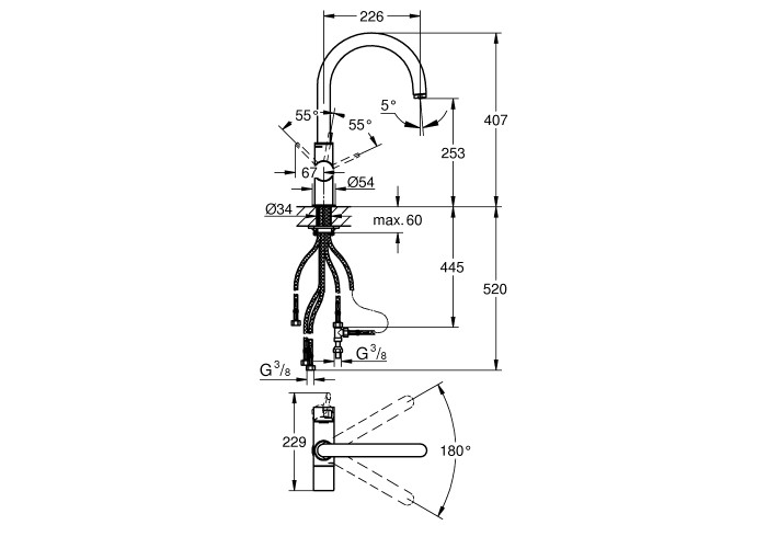 GROHE SilkMove - плавність ходу важеля. GROHE StarLight - хромоване покриття. GROHE ComfortHeight - високий вилив. GROHE SmoothTurn - плавний поворот виливу. GROHE Two water - подавання очищеної фільтрованої і технічної води з водопроводу.