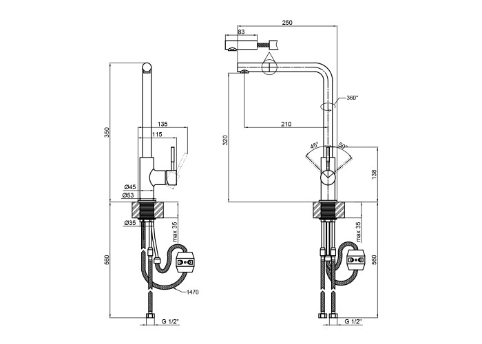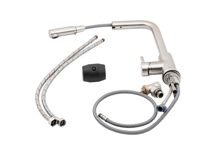 Змішувач, шланг для висувної лійки, гнучкий підвід, кріпильні деталі, якір.