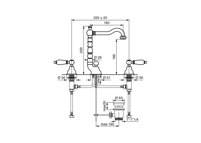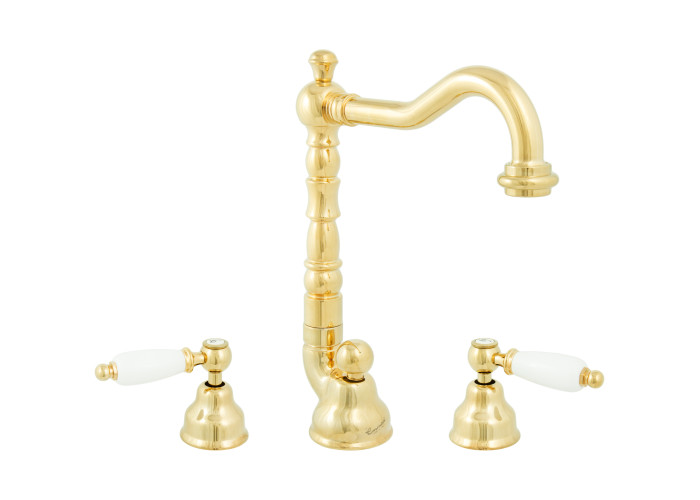Представлений тут двовентильний, настільний змішувач для умивальника Deco-Ceramica OR121643 від Emmevi, виготовлений з високоякісної латуні з покриттям кольору золота, і має поворотний вилив з виносом 19 см. Модель встановлюється на три отвори використовуючи гнучкі шланги для підведення води М10*1/2″.
