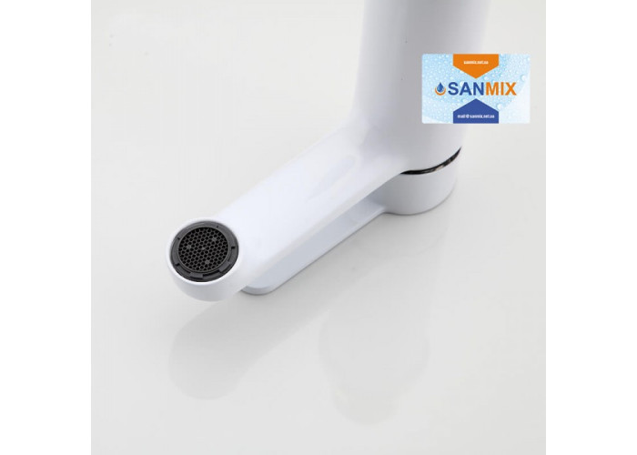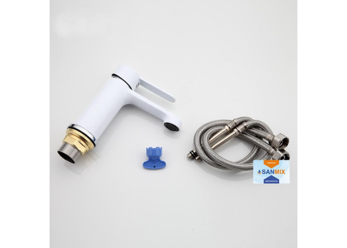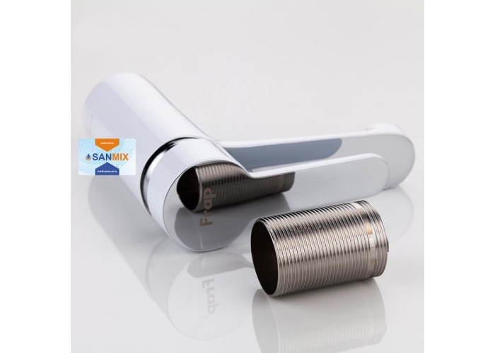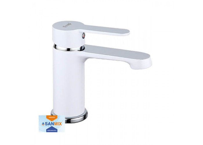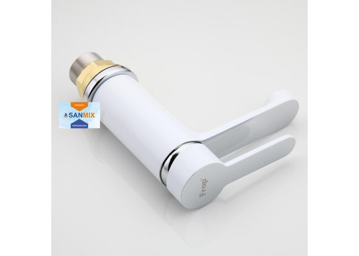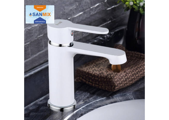 Змішувач для умивальника Frap H41 F1041 латунний пофарбований у білий колір. Він буде мати гарний вигляд у світлих інтер'єрах. Його велика ручка зручна в експлуатації, добре лягаючи в будь-яку руку. У той же час він простий в догляді, оскільки фарбування відмінно миється. А захований під нею латунний корпус не боїться іржі, оскільки не окислюється під дією води. У той же час змішувач для умивальника Frap F1041 має гайку, яка дає можливість встановлювати його на товсті поверхні. А картріджіний затвор може регулювати всі показники потоку однією рукою.