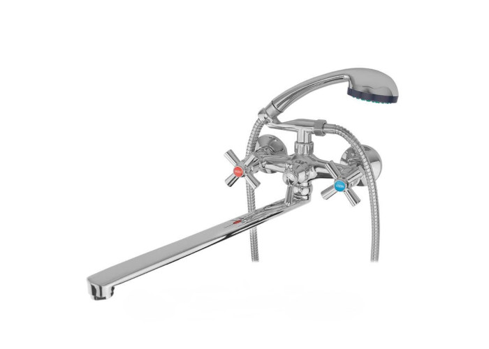 Вентильний змішувач для ванни WEZER DFR7-В722 з довгим плоским гусаком. Довжина гусака – 35 см. Кульовий перемикач на душ. Кріплення настінне. Матеріал – силумін, покриття хром. Комплектація: змішувач, лійка для душу, тримач для лійки на корпусі змішувача, шланг для душу (1,45 м), кріплення, ексцентрики, паспорт, гарантія. Виробник – Китай. Клас товару – економ.