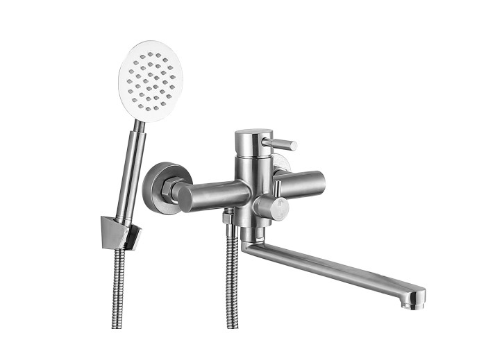 Змішувач для ванни EKO7-01 Wezer - якісний виріб, зроблений з нержавіючої сталі. Даний матеріал запобігає утворенню іржі і захищає пристрій від вологи. Нержавіюча сталь також володіє міцністю, яка продовжують термін експлуатації змішувача. Всі вироблені компанією Wezer змішувачі проходять контроль якості на всіх етапах виробництва. Даний метод збільшує як якість, так і працездатність виробів. Діаметр картриджа: 35 мм. Тип кріплення: настінний. Гусак: поворотний / довгий, з аератором. Довжина виливу: 350 мм. Шланг: 1500 мм. Душова лійка з нержавійки. Довжина лійки: 230 мм. Відстань між точками підключення: 150 мм. Розмір ручки: 100 мм. Перехідні ексцентрики: 1/2 х 3/4 дюйма. Тримач лійки з кріпленнями: в наявності. Країна-виробник - Китай.