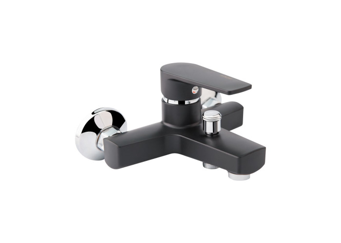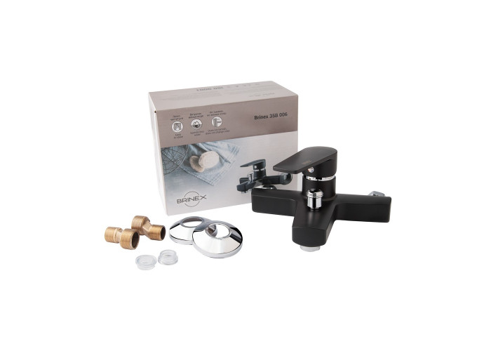 Змішувач для ванни Brinex 35B 006 виконаний з пластику та має чорну матову поверхню. Для вмикання подачі води досить підняти й повернути руків‘я в необхідне положення. На нього нанесено маркування Х+Г води. Настінний монтаж змішувача здійснюється за допомогою кріпильних елементів з комплекту. Круглі хромовані розетки приховають похибки установки на обробці ванної кімнати. У виробі передбачений вихід для підключення душового шланга.