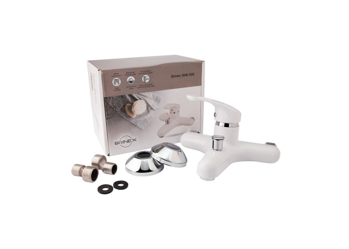Змішувач для ванни Brinex 31CW 006N виконаний з високоякісного силуміну и має білу матову поверхню. Для вмикання подачі води досить підняти й повернути руків‘я в необхідне положення. На нього нанесено маркування Х+Г води. Настінний монтаж змішувача здійснюється за допомогою кріпильних елементів з комплекту. Круглі хромовані розетки приховають похибки установки на обробці ванної кімнати.