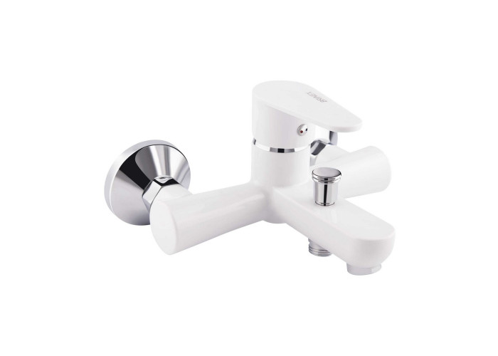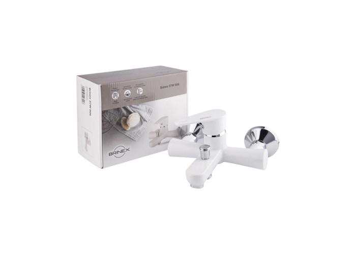 Змішувач для ванни Brinex 37W 006 виконаний з пластику та має білу матову поверхню. Для вмикання подачі води досить підняти й повернути руків‘я в необхідне положення. На нього нанесено маркування Х+Г води и фірмовий логотип виробника. Настінний монтаж змішувача здійснюється за допомогою кріпильних елементів з комплекту. Круглі розетки приховають похибки установки на обробці ванної кімнати.
