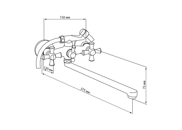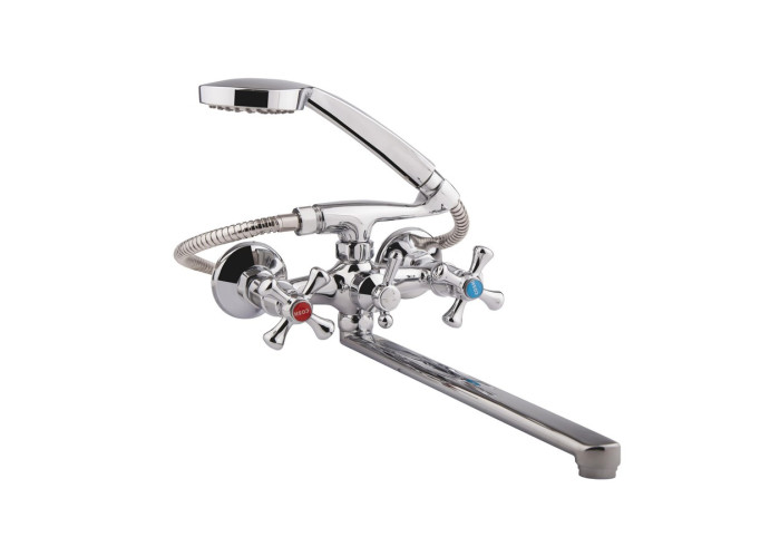 Змішувач для ванни Cosh (CRM)/S- 21-143B з довгим поворотним виливом виготовлений з тримачем ручного душу та лійкою. Для вмикання подачі води передбачено два вентилі с маркуванням Х+Г води. Настінний монтаж змішувача здійснюється над ванною за допомогою кріпильних елементів з комплекту. Круглі хромовані розетки приховають похибки установки на обробці ванної кімнати. Перемикання на ручний душ виконується поворотним дивертером.