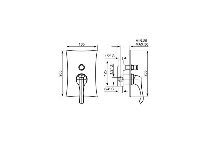 Модель виготовлена з латуні з покриттям кольору хрому, кріпиться на один отвір за допомогою з’єднання під діаметр 1/2″, має керамічний картридж, діаметр декоративної панелі 20.5 см і обладнується перемикачем ванна/душ.