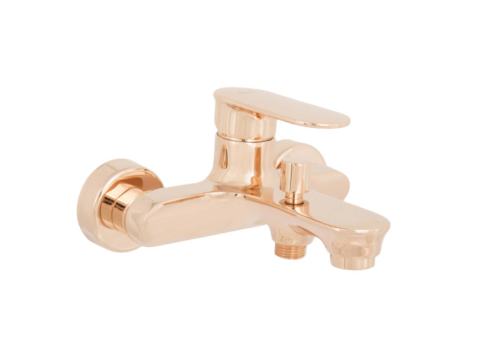 Модель виготовлена з латуні з покриттям кольору рожеве золото, кріпиться на два отвори за допомогою з’єднання під діаметр 1/2″, має керамічний картридж, довжина виливу становить 17.72 см і оснащується перемикачем ванна/душ.