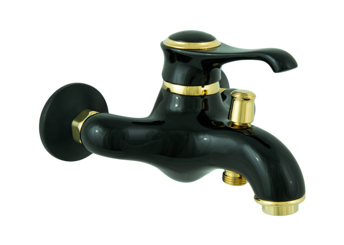 Представлена тут модель настінного, одноважільного змішувача для ванни NO6001 серії Tiffany від Emmevi, виготовлена з високоякісної латуні з покриттям чорного і золотого кольорів, обладнується стаціонарним виливом із виносом 22.5 см, верхнім перемикачем ванна/душ, нижнім відводом для під’єднання душового шланга під діаметр 1/2″, і встановлюється на два отвори за допомогою ексцентрикового з’єднання під діаметр 1/2″.