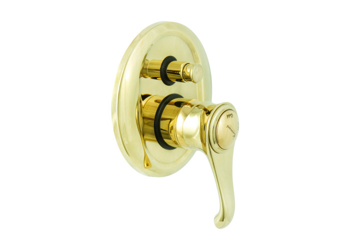 Модель виготовлена з латуні із покриттям золотого кольору, кріпиться на один отвір, має діаметр декоративної панелі 15.5 см і обладнується перемикачем ванна/душ.