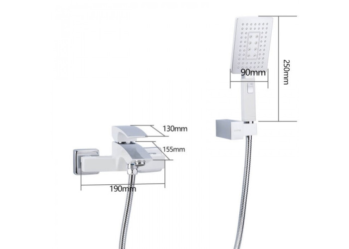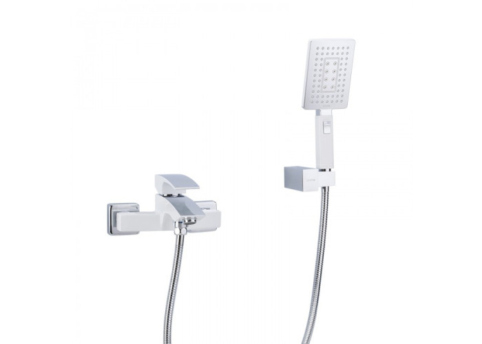 У комплекті до змішувача йдуть 3-х режимна лійка прямокутної форми, душовою шланг в якісній латунної оплетке і можливістю повороту на 360 градусів, а також тримач для лійки. Прилад управляється металевим важелем, кріпиться на стіну ексцентриками які ховаються за квадратними декоративними відбивачами.