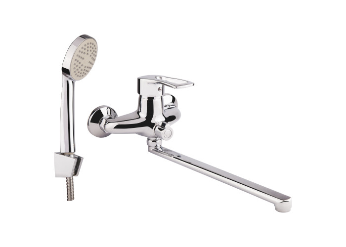 Змішувач для ванни GF (CRM)/S-04-005N з довгим поворотним виливом укомплектований тримачем ручного душу, душовим шлангом і лійкою. Для вмикання потоку води передбачено зручний важіль з отвором та нанесеним маркуванням Х+Г води, для перемикання на душ - поворотний дивертор. Настінний монтаж здійснюється за допомогою кріпильних деталей, які комплектуються разом зі змішувачем. Круглі розетки приховають всі погрішності установки.