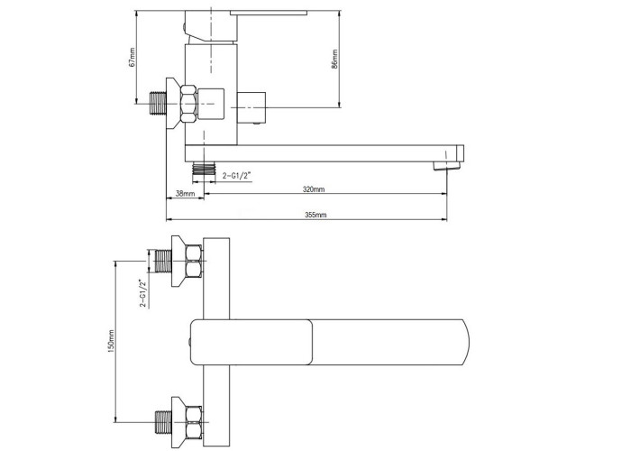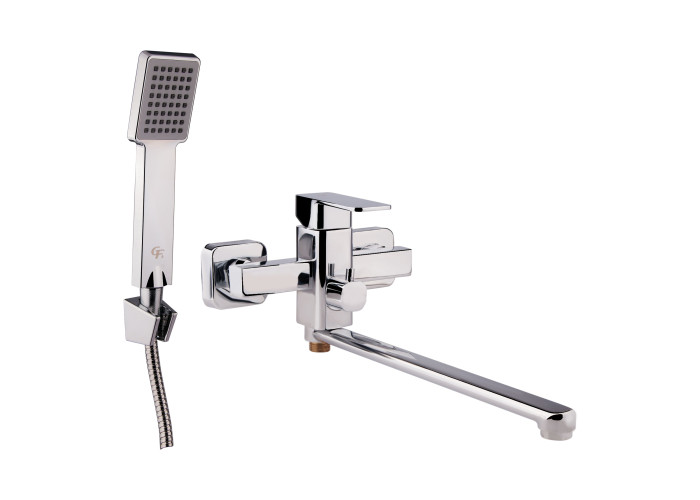 Змішувач для ванни GF (CRM)/S-10-005AN виконаний в кубічному стилі з тримачем ручного душу, душовим шлангом і лійкою хромованого кольору. Для вмикання потоку води передбачено важіль, для перемикання на душ - поворотний дивертор-важіль. Настінний монтаж здійснюється за допомогою кріпильних деталей, які комплектуються разом зі змішувачем. Квадратні розетки приховають всі погрішності установки на обробці ванної кімнати.