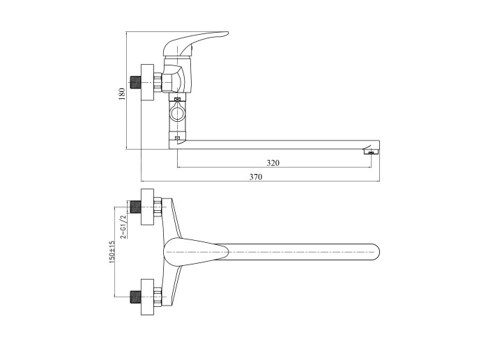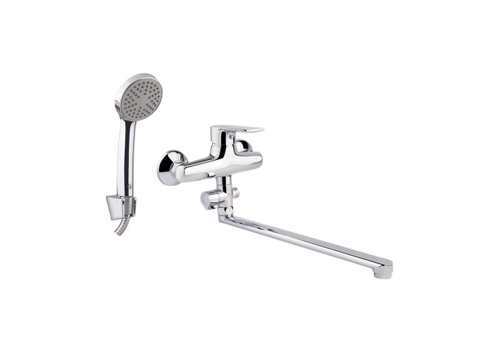 Змішувач для ванни GF (CRM)/S-12-005 з довгим поворотним виливом виготовлений з силуміну, укомплектований кронштейном для лійки, душовим шлангом і лійкою. Для вмикання потоку води передбачено важіль з нанесеним маркуванням Х+Г води, для перемикання на душ - поворотний дивертор. Настінний монтаж здійснюється за допомогою кріпильних деталей, які комплектуються разом зі змішувачем. Круглі розетки приховають всі погрішності установки на обробці ванної кімнати.