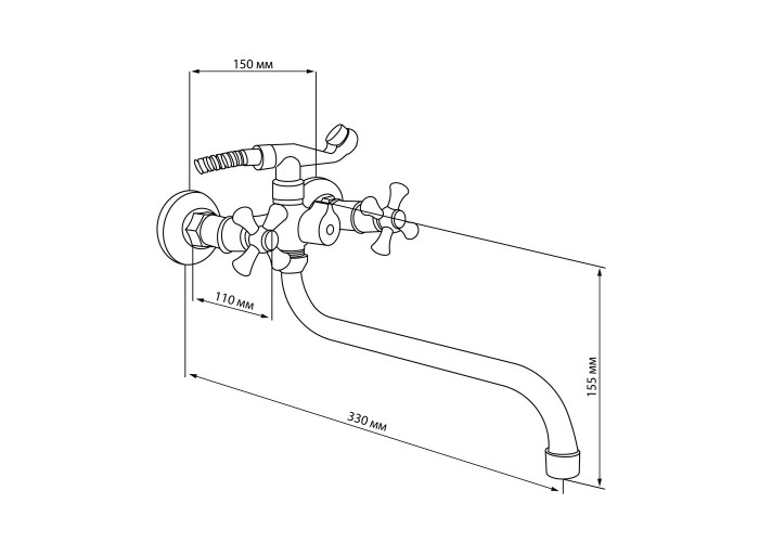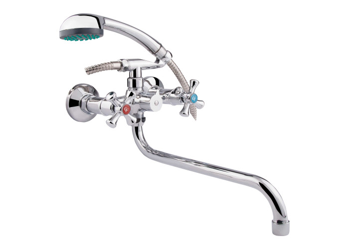 Змішувач для ванни GF (CRM)/S-21-140S з довгим поворотним виливом виконаний з інтегрованим шланговим під‘єднанням, укомплектований душовим шлангом і лійкою. Для вмикання потоку води передбачено два вентиля з нанесеними маркуванням Х+Г води і фірмовими логотипами виробника, для перемикання на душ - поворотний дивертор. Настінний монтаж здійснюється за допомогою кріпильних деталей, які комплектуються разом зі змішувачем. Круглі розетки приховають сліди установки на обробці.