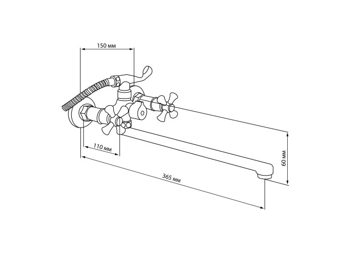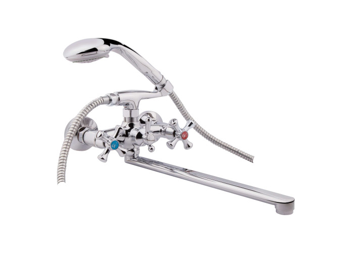Змішувач для ванни GF (CRM)/S-21-143 з довгим виливом виконаний з якісного матеріалу із шланговим підключенням, душовим шлангом і лійкою. Для вмикання потоку води передбачено два вентиля з нанесеним маркуванням Х+Г води, для перемикання на душ - поворотний дивертор у вигляді важеля. Настінний монтаж здійснюється за допомогою кріпильних деталей, які комплектуються разом зі змішувачем. Круглі розетки приховають всі погрішності установки.
