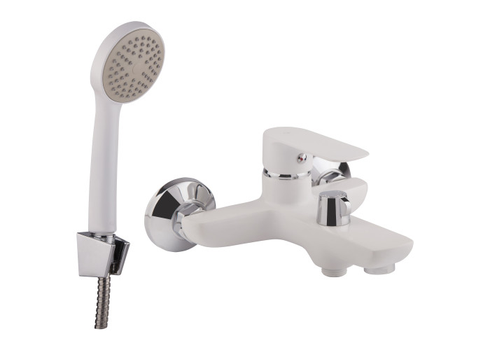 Змішувач для ванни GF (WCR)/S-07-005N з фіксованою виливом виконаний в білому кольорі з тримачем ручного душу, душовим шлангом і лійкою. Для вмикання потоку води передбачено зручний важіль з нанесеним маркуванням Х + Г води, для перемикання на душ - поворотний дивертор. Настінний монтаж здійснюється за допомогою кріпильних деталей, які комплектуються разом зі змішувачем. Круглі хромовані розетки приховають всі погрішності установки.