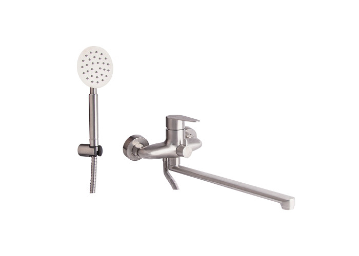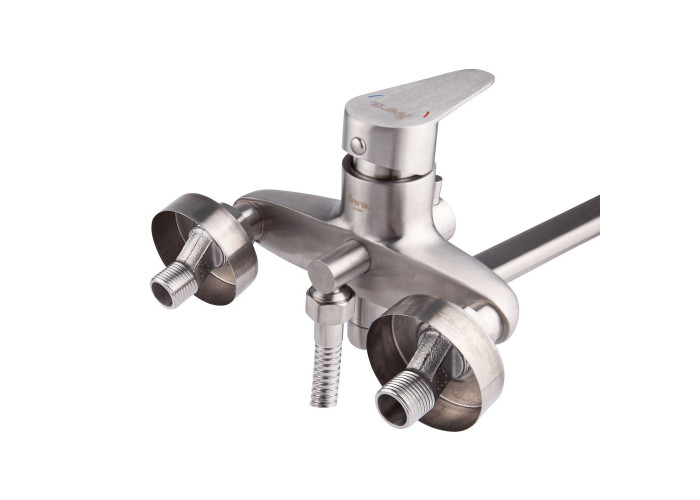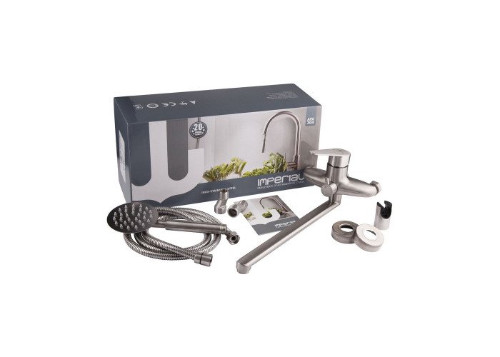 Змішувач для ванни Imperial 32-005N-00 виконаний з нержавіючої сталі, що гарантує тривалий термін експлуатації. Для вмикання подачі води досить підняти важіль і повернути його в необхідний бік. Змішувач монтується на стіну над ванною за допомогою кріпильних елементів, які комплектуються разом зі змішувачем. Круглі розетки приховають похибки установки на обробці. Тримач лійки також кріпиться на стіну. Таким чином, ваші руки будуть вільні під час прийняття душу.