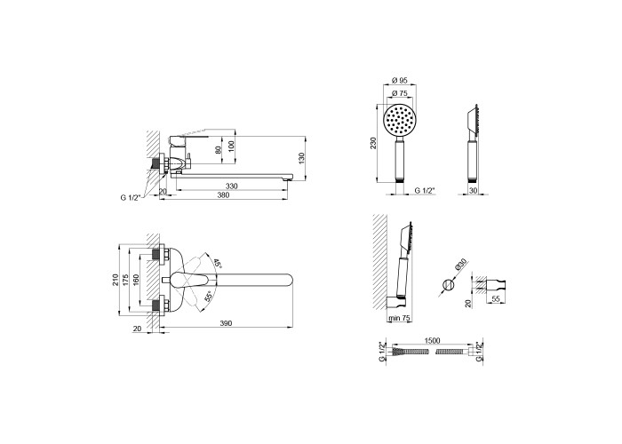 Змішувач, кронштейн для ручного душу, лійка для ручного душу, душовий шланг, кріпильні деталі.