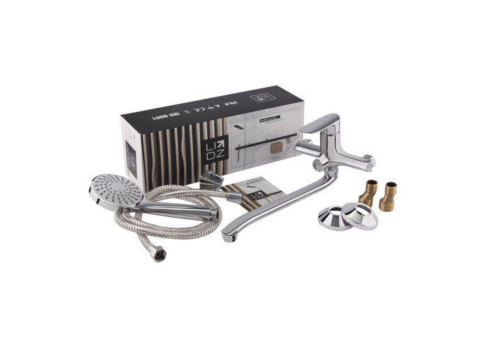 Змішувач для ванни Lidz (CRM) 15 36 005 00 виконаний в хромованому кольорі з глянсовою поверхнею з довгим поворотним виливом. Разом з нерухомим тримачем ручного душу він монтується на стіну над ванною. Круглі декоративні розетки приховають всі похибки установки. Напір води і її температура регулюються поворотом важеля з нанесеним маркуванням Х + Г води в необхідне положення. Перемикання ванна / душ здійснюється поворотом дивертора.