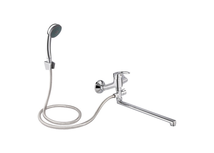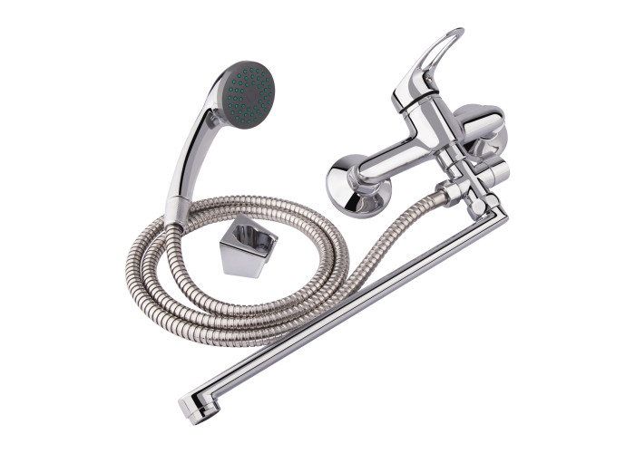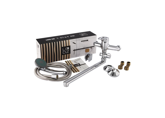 Змішувач для ванни Lidz (CRM) 16 37 005 02 виконаний в хромованому кольорі з глянсовою поверхнею з довгим поворотним виливом. Разом з нерухомим тримачем для душу він монтується на стіну над ванною. Круглі декоративні розетки приховають всі похибки установки. Напір води і її температура регулюються поворотом важеля з отвором і нанесеним маркуванням Х + Г води в необхідне положення. Перемикання ванна/душ здійснюється поворотом дивертора.