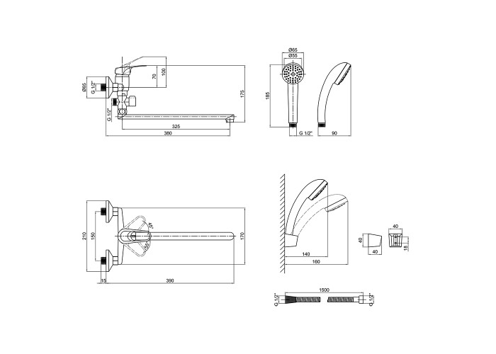 Змішувач, лійка для ручного душу, душовий шланг, кронштейн для ручного душу, кріплення.