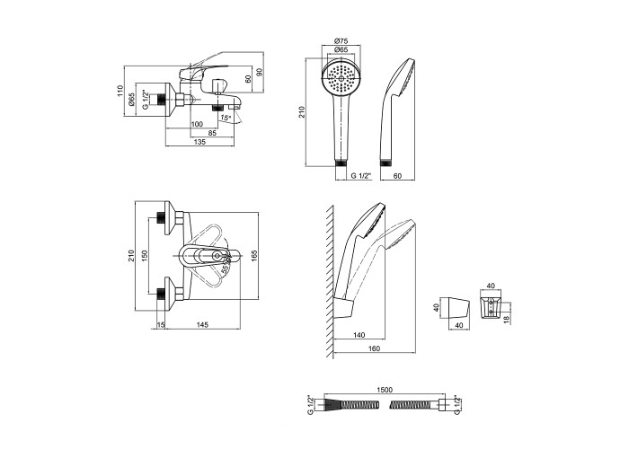 Змішувач, лійка для ручного душу, душовий шланг, кронштейн для ручного душу, кріплення.