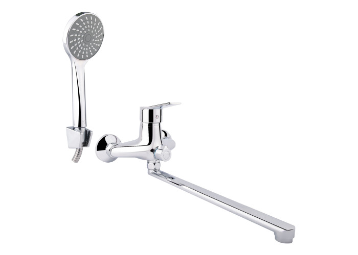 Змішувач для ванни Lidz (CRM) 40 87 005-1 має довгий вилив і вигнуте руків‘я з нанесеним маркуванням Х + Г води. Для вмикання подачі води досить підняти та повернути його в потрібне положення. Змішувач та тримач лійки монтуються на стіну за допомогою кріпильних елементів, які є в комплекті. Круглі хромовані розетки приховають похибки установки на обробці ванної кімнати. Перемикання на ручний душ виконується поворотним дивертером.