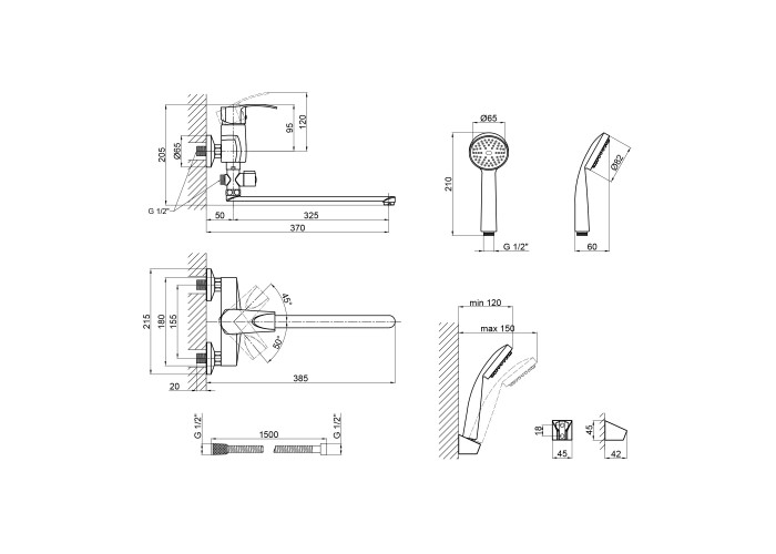 Змішувач, лійка для ручного душу, душовий шланг, кронштейн для ручного душу, кріплення.