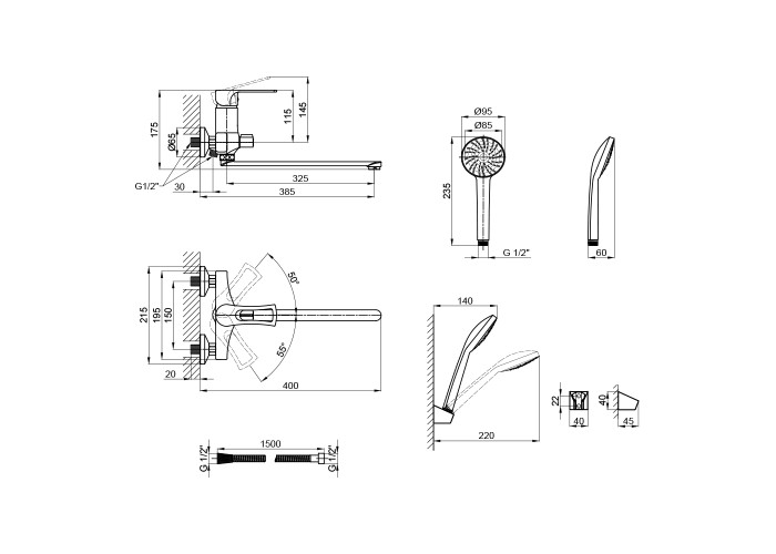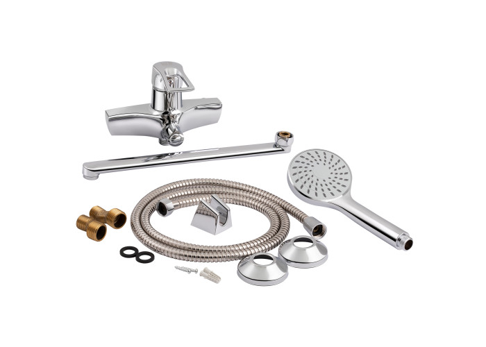 Змішувач, лійка для ручного душу, душовий шланг, кронштейн для ручного душу, кріпильні деталі.